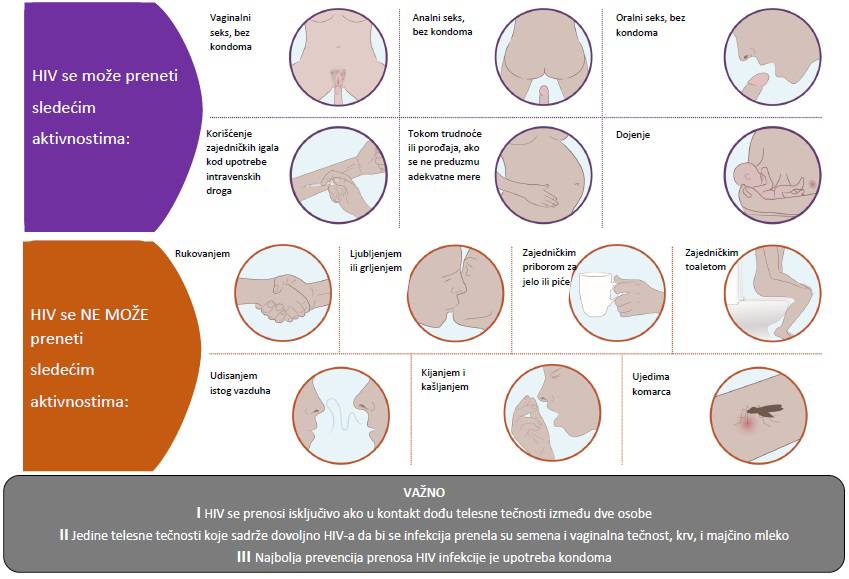 HIV infekcija se prenosi na 3 načina: nezaštićenim seksualnim odnosom (bez kondoma), razmenom igala za ubrizgavanje droge i vertikalnom transmisijom sa majke na dete.